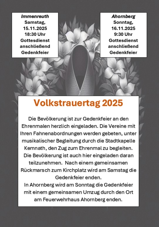 In Immenreuth findet die Gedenkfeier am Samstag, 15.11.2025 und in Ahornberg am Sonntag, 16.11.2025 statt.
