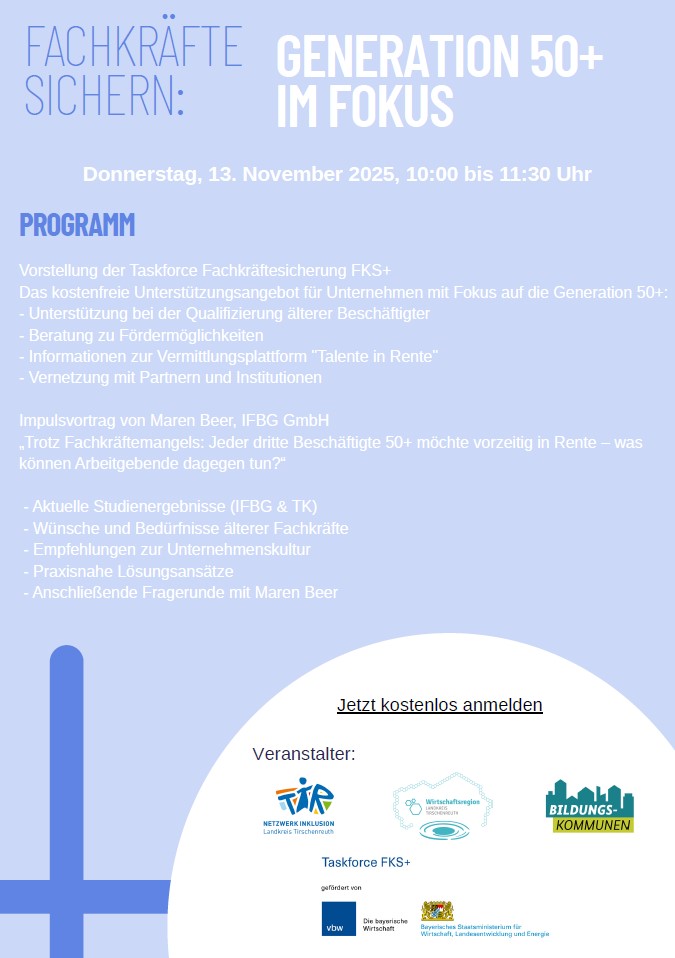 Die Wirtschaftsförderung des Landkreises Tirschenreuth bietet in Zusammenarbeit mit dem Netzwerk Inklusion und der Taskforce Fachkräftesicherung FKS+ am 13.11.2025 ein kostenfreies Webinar an.