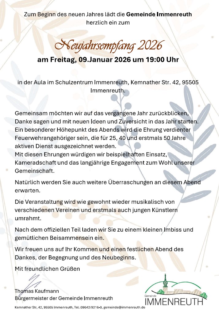 Wir laden Sie zum Neujahrsempfang der Gemeinde Immenreuth ein. Weitere Details entnehmen Sie gerne der beigefügten Einladung.