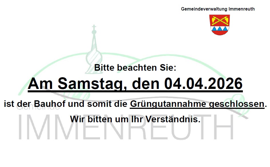 Bitte beachten Sie: Am Samstag, den 04.04.2026 ist der Bauhof und somit die Grüngutannahme geschlossen.
