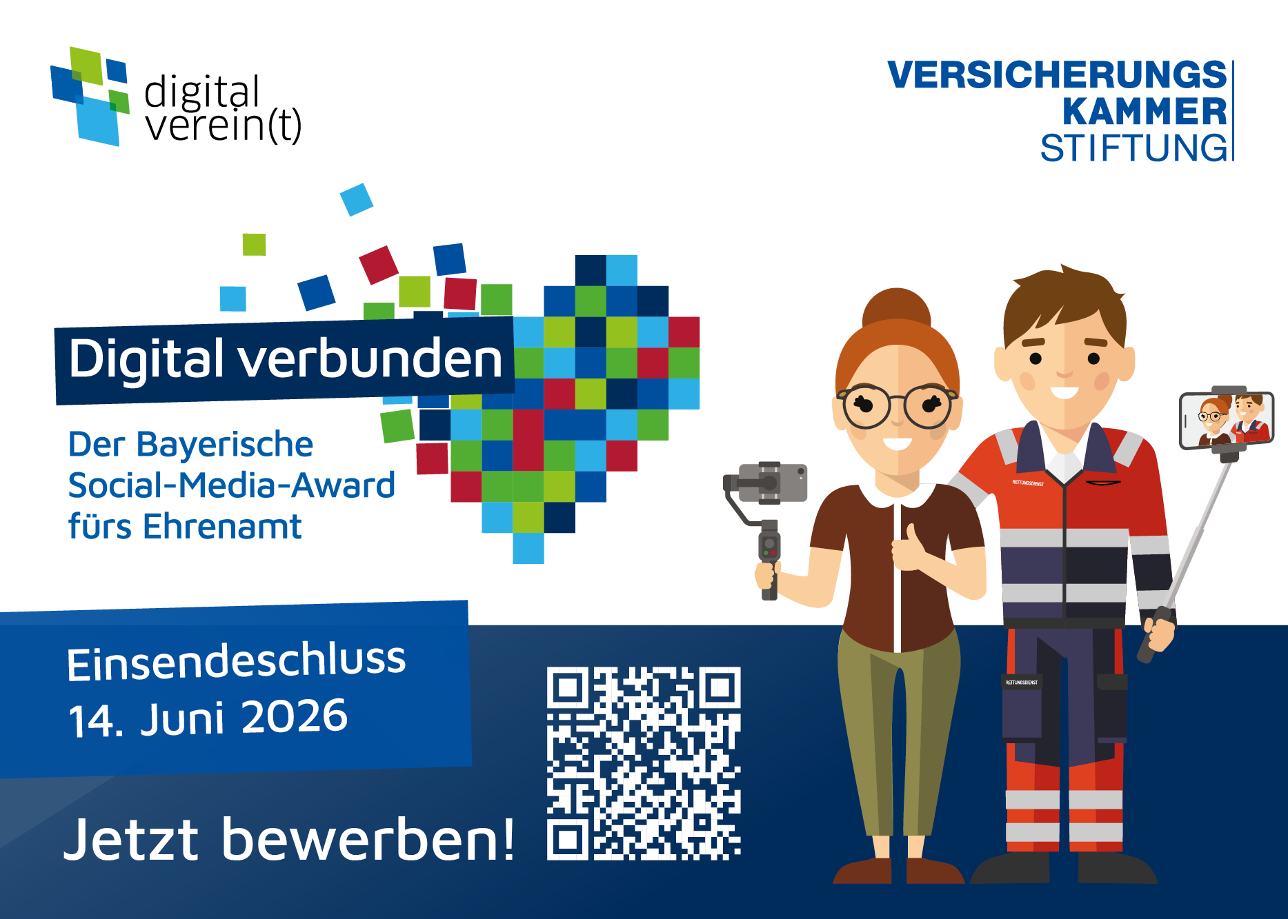 Der Bayerische Social-Media-Award fürs Ehrenamt wird 2026 zum zweiten Mal verliehen – eine gemeinsame Initiative der Versicherungskammer Stiftung und der lagfa bayern mit ihrem Projekt „digital verein(t)“.